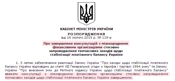 А уже 16 февраля – неожиданно для всех – Кабмин принял распоряжение №119-р, в котором объявил, что "правительство считает консультации с международными финансовыми организациями... завершенными". И, соответственно, ввел в действие конфликтный импортный сбор.