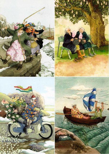 Фінляндська художниця Інге Льойок (Inge Löök) стала відомою у світі завдяки серії зображень веселих бабунь, які не бажають старіти, намальованих нею для Червоного Хреста.