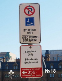 Вказівник у паркінгу столичного міста Оттава біля велетеньської споруди парламенту Канади. Напис: "Паркінг заборонено. Дозволено паркування тільки за інвалідними посвідченнями та для сенаторів".