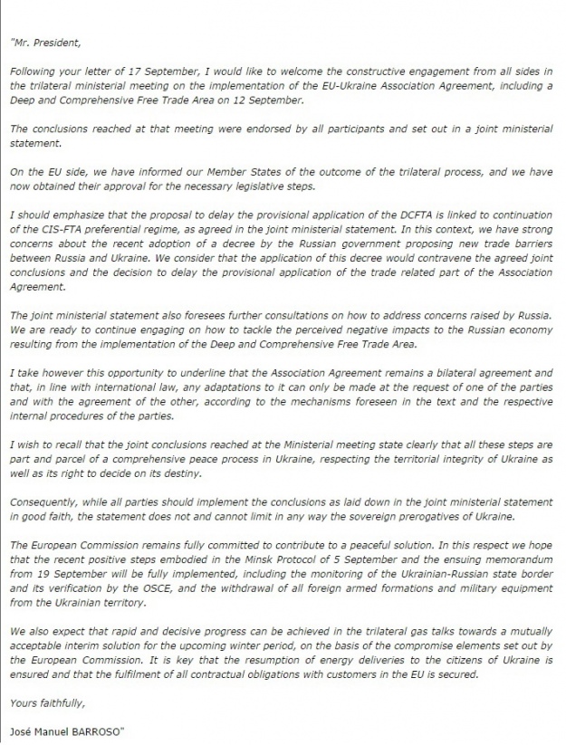 Відповідний лист Баррозу, датований 1 жовтня, був оприлюднений на сайті ЄК.