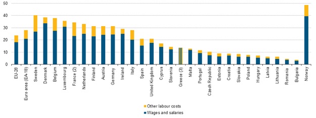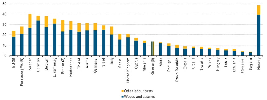 Порівнюючи офіційні дані про середній рівень погодинної оплати праці навіть на квітень 2014 року, видно, що рівень оплати в Болгарії і в Швеції або Данії відрізняється в 3-4 рази.