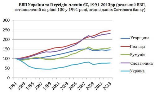Як показано на малюнку, відколи розпався Східний блок, чотири сусіди України, які згодом приєдналися до ЄС, демонстрували середнє річне зростання понад 3% (у 1992–2013 роках реальне зростання економіки в Польщі становило 4,2%, у Словаччині – 4,1%, в Румунії – 2,2%, в Угорщині – 1,7%, за даними Світового банку ), тоді як ВВП України в середньому щорічно скорочувався на 0,7%.