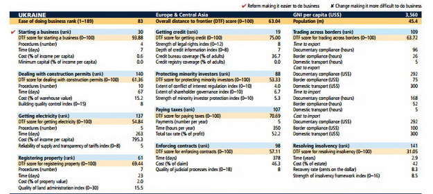 Ми – 107-мі у світі за легкістю сплати податків, 109-ті – за легкістю транскордонної торгівлі і 141-ші(!!!) – за легкістю вирішення проблеми неплатоспроможності.