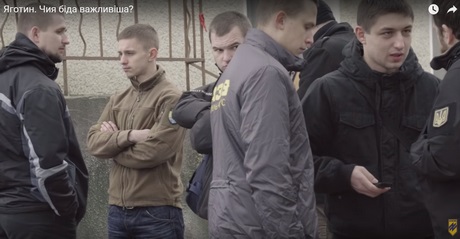 | Активісти ЦК "Азов" на мітингу проти біженців у Яготині |