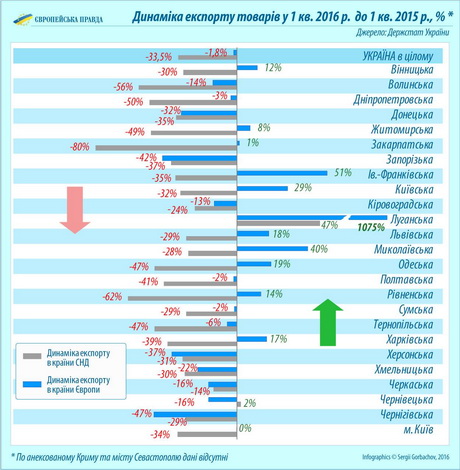 Однак експорт в Європу в першому кварталі зріс більш ніж у 10 разів! Це дозволяє називати Луганщину "лідером євроінтеграції".