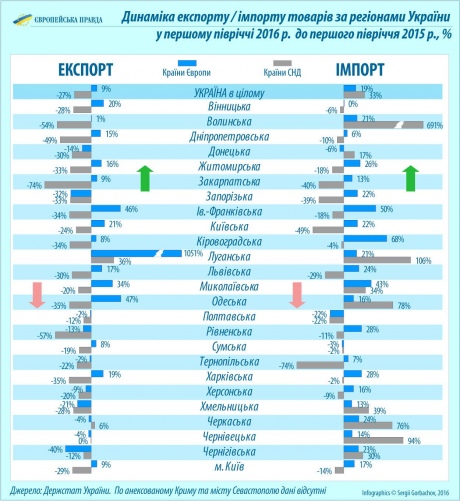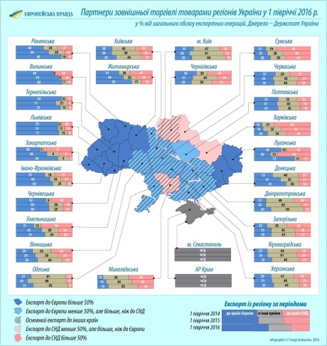 "Європейська правда" продовжує публікувати статистику зовнішньої торгівлі в розрізі українських регіонів. Ця статистика не публікується Держстатом на його основному сайті, однак вона дозволяє зрозуміти, як відбувається переорієнтація українського експорту в кожній з областей країни.