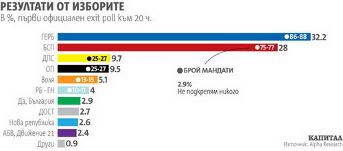 За результатами виборів можна сказати, що "російського реваншу" не буде. За результатами підрахунку 97,17% голосів, ГЕРБ набирає 32,63%, а її головний опонент – Болгарська соціалістична партія (БСП) – 27,1%.