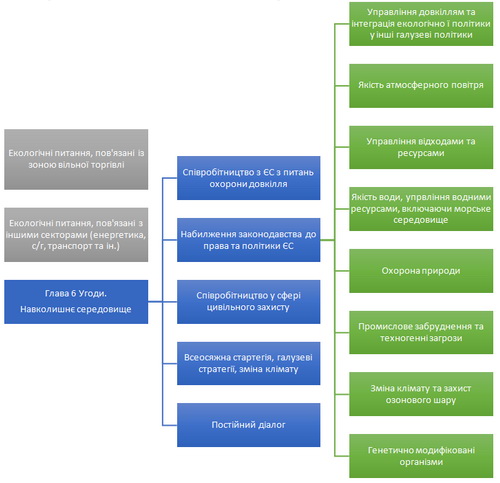 Основним відповідальним органом за імплементацію екологічної складової Угоди є Мінприроди, яке є головним виконавцем більшості планів імплементації директив та регламентів в екологічній сфері.