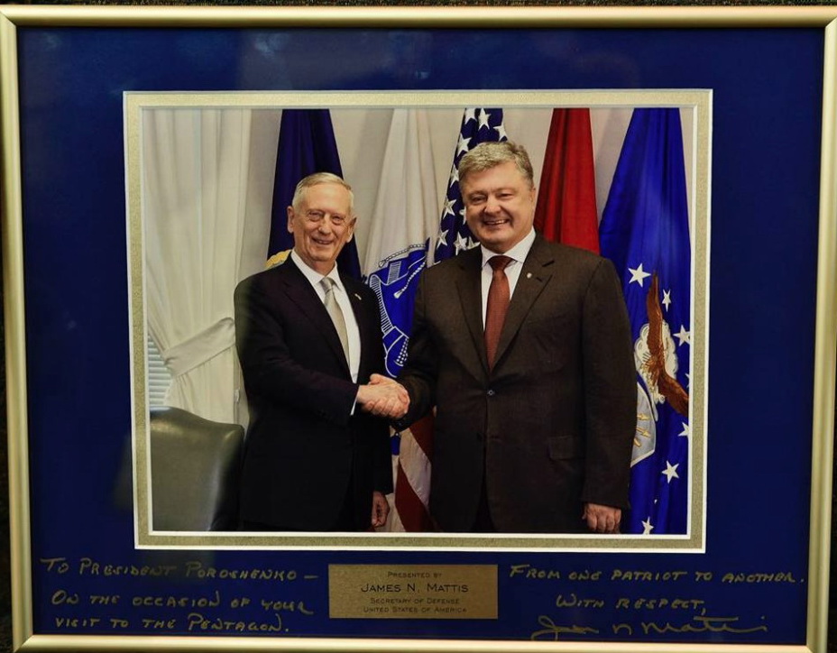 Меттіс, широко шанований у США, сказав, що Україна й США розділяють "зобов'язання щодо принципів, покладених в основу міжнародного порядку". Він зробив наголос на таких словах, як "суверенітет, територіальна цілісність та свобода від примусу". Міністр оборони США також високо оцінив здатність України захищати себе "всупереч усім шансам" і "в умовах небезпеки від агресії, кібератак і сусідства без довіри", та подарував Порошенку фотографію, на якій вони стоять удвох, підписану словами: "Від одного патріота іншому — з повагою".