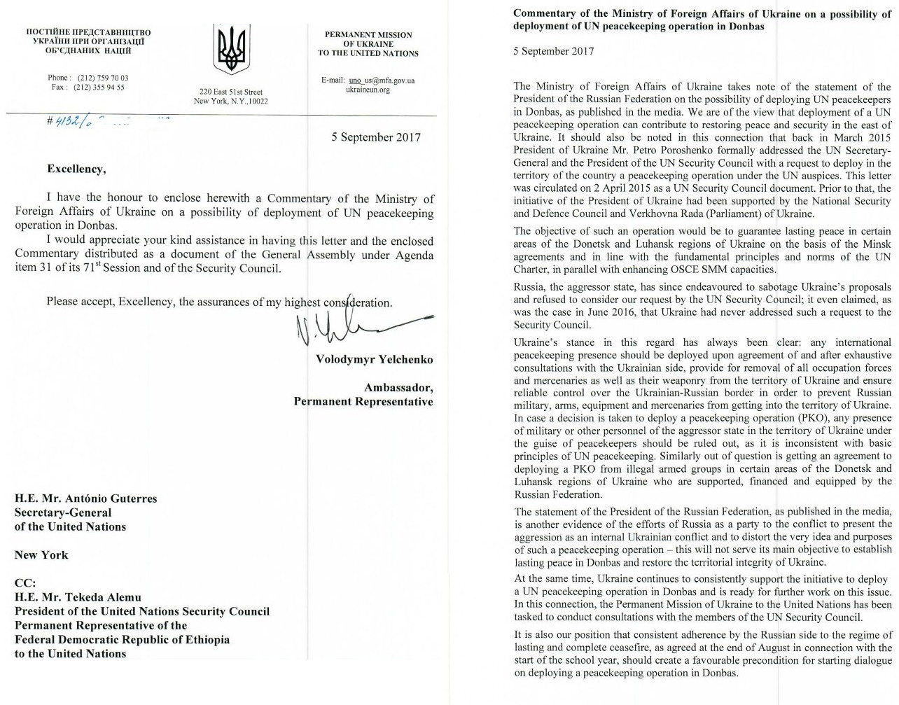 Причому росіяни не можуть навіть сказати, що вони "забули про старі ідеї" Києва або що вони вирішили, що ці пропозиції втратили актуальність. 5 вересня МЗС окремо нагадав про лист Порошенка на адресу генсека ООН та голови РБ ООН, а українська місія у Нью-Йорку переклала прес-релиз міністерства і знову спрямувала його генсеку та Раді безпеки.