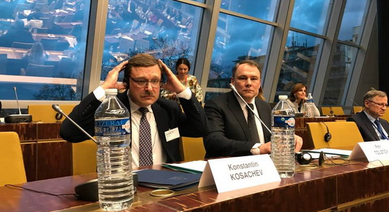 | Віце-спікер Держдуми Петро Толстой (в центрі) та голова комітету Ради федерації у міжнародних справах Костянтин Косачов |