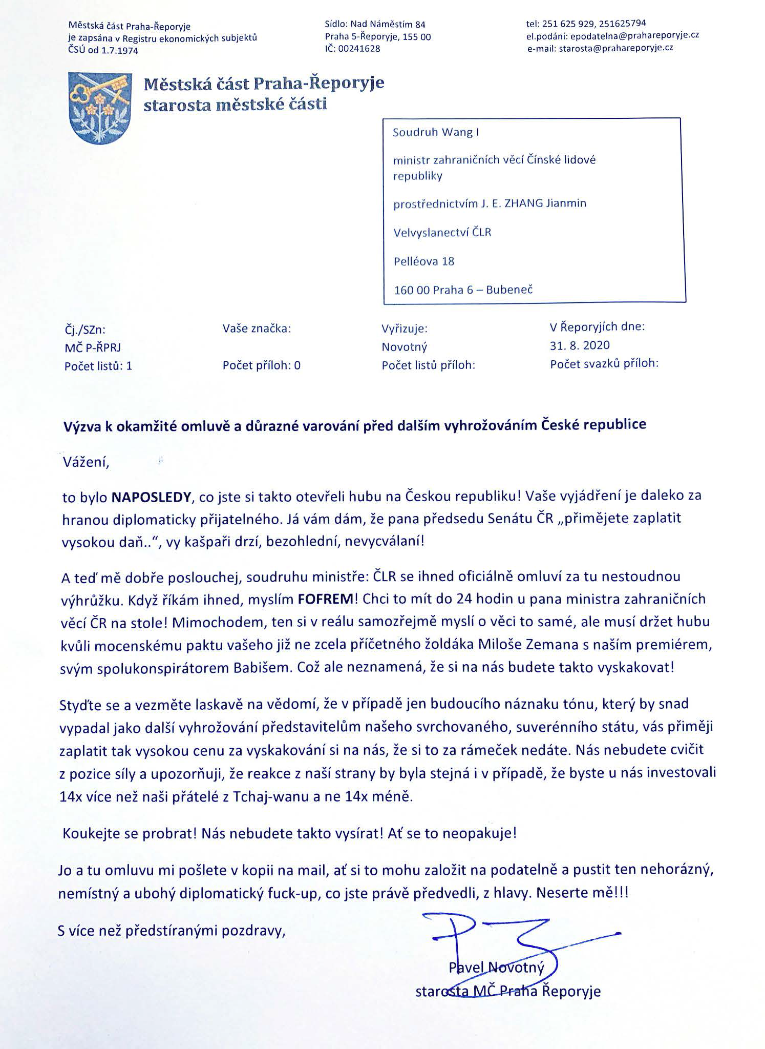 Саме так можна трактувати лист ще одного представника місцевого самоврядування, старости празького району Ржепориє (це виборна посада, аналог мера) Павла Новотного на адресу очільника МЗС Китаю.