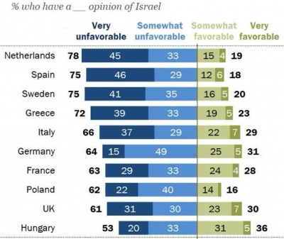 А одночасно дослідження Pew Research Center підтвердило, що негативне та дуже негативне ставлення до Ізраїлю збирає більшість населення в усіх європейських країнах.