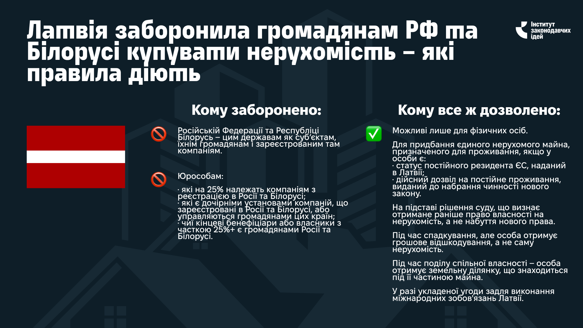 Водночас закон залишає вузькі та чітко визначені винятки для фізичних осіб. Зокрема, це стосується спадкування чи єдиного житла за наявності статусу постійного резидента ЄС, виданого Латвією, або постійного дозволу на проживання в Латвії, набутих до набрання чинності законом.