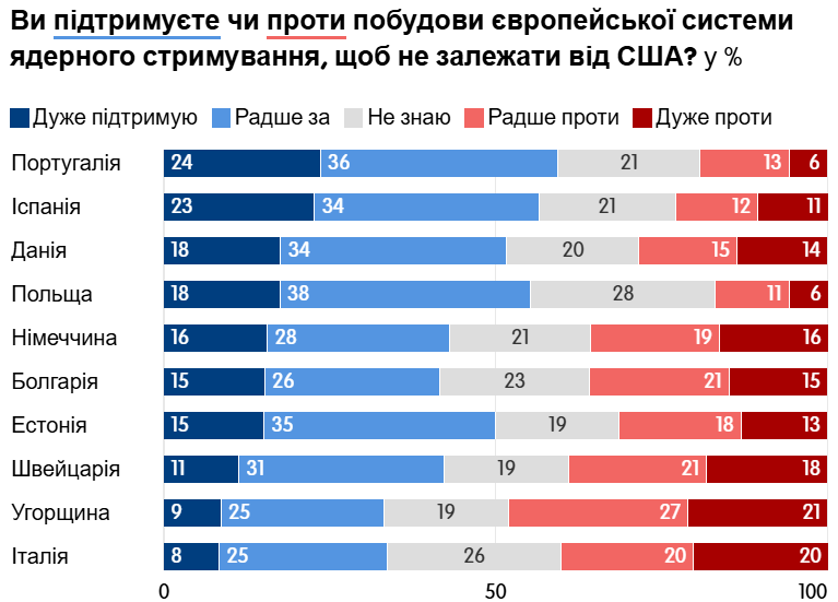 Це наочно підтверджує опитування, яке ECFR провела у листопаді 2025 року в 11 європейських державах НАТО – це Велика Британія, Німеччина, Франція, Італія, Іспанія, Польща, Данія, Естонія, Португалія, Угорщина, Болгарія, а також у двох державах поза Альянсом – в Україні та Швейцарії.