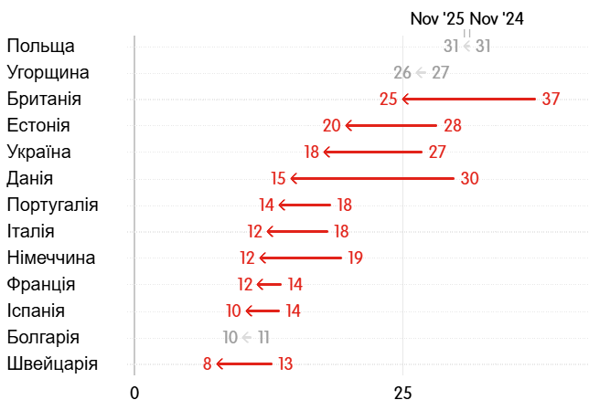 Але якщо у Польщі чи Угорщині падіння було мінімальним, менше 1%, то у Данії воно очікувано є найбільшим – з 30% у 2024-му до 15% у 2025-му.