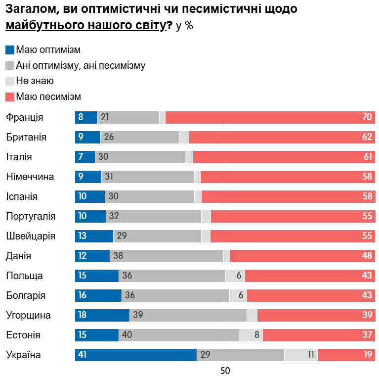 Також опитування засвідчило, що європейці не мають добрих очікувань щодо майбутнього – ані власної країни, ані усього світу. Єдиною державою Європи, що зберігає оптимізм, виявилася… Україна.