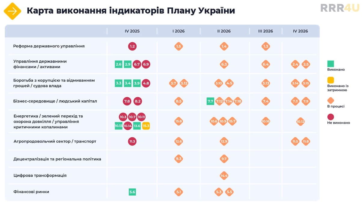 Але ситуація стала ще гіршою у четвертому кварталі 2025 року, коли було не виконано численні індикатори, більшість з яких – законодавчі акти. Важливо, що йдеться не про подання законодавчих актів в парламент, а про набуття ними чинності.