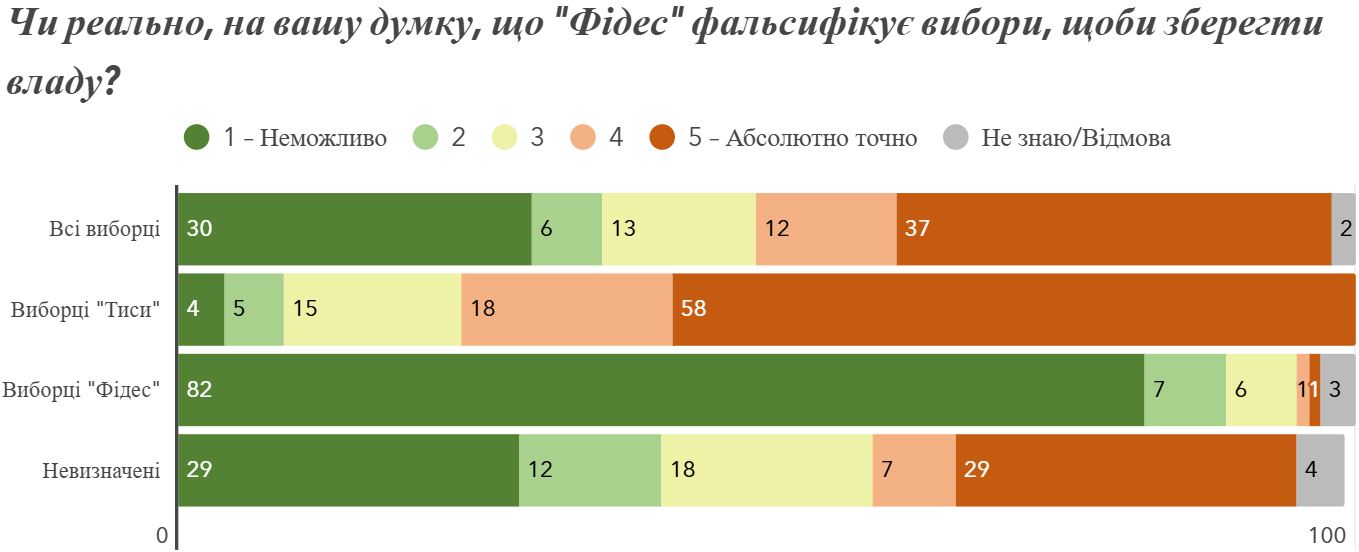 Серед виборців "Фідеса" 27% вважають, що "Тиса" не фальсифікуватиме результат виборів, ще 5% не знають відповіді, а 68% припускають фальсифікації від "Тиси" тією чи іншою мірою. У тому числі 44% – абсолютно у цьому впевнені. Відповідь на питання, як "Тиса", перебуваючи в опозиції і не маючи доступу до інститутів влади, може фальсифікувати голоси – лишимо за тими прибічниками Орбана, хто у це вірить.