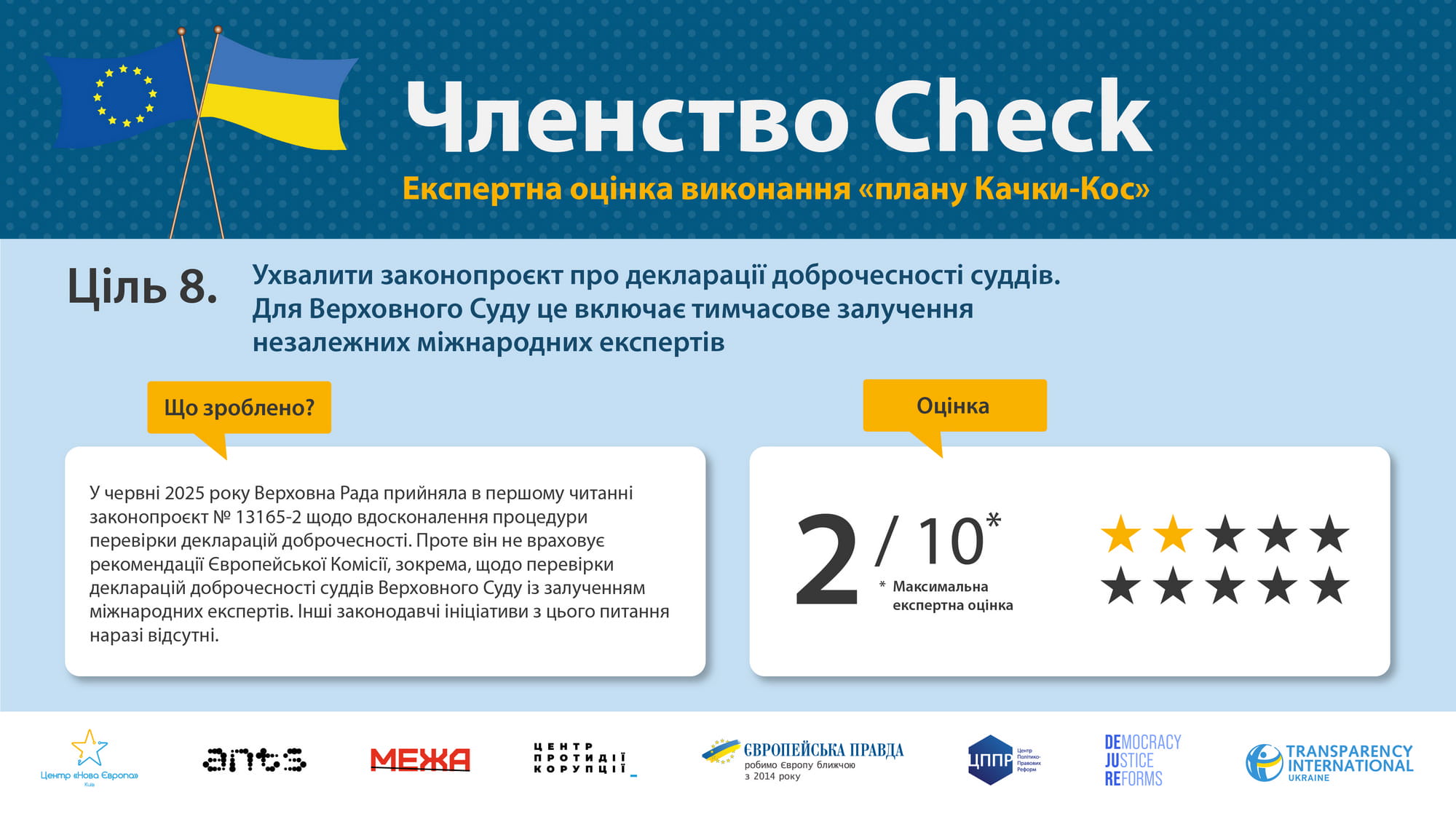 Наразі є лише 2 пункти плану з 10, за якими Україна досягла хоча б 20% виконання, тобто рівня на кшталт "законопроєкт зареєстрований" – це п.п. 6 та 8. Причому за останнім навіть ця оцінка є дещо натягнутою. Адже законопроєкт щодо декларацій про доброчесність суддів не враховує пряму вимогу "плану Качки-Кос" – він не поширюється на суддів Верховного суду.