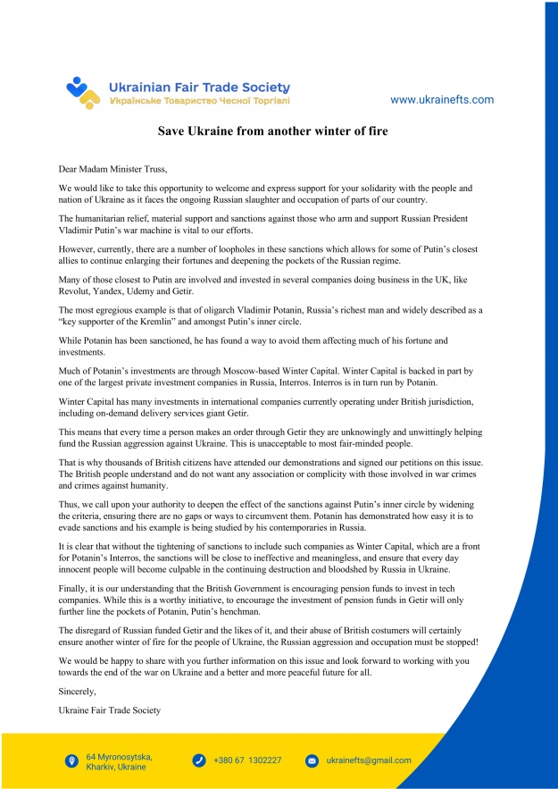 The "Ukrainian Fair Trade Society" addressed open letters to the President of the European Union, Ursula von der Leyen, and the Prime Minister of Great Britain, Elizabeth Truss, with a call to increase the impact of sanctions against Putin's inner circle.