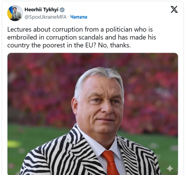 Heorhii Tykhyi, spokesman for Ukraine's Foreign Ministry, commented on Orbán's latest social media posts about a corruption scandal in Ukraine, where the Hungarian leader spoke of a "wartime mafia" supposedly linked to President Volodymyr Zelenskyy and urged Brussels to stop providing financial support to Ukraine.