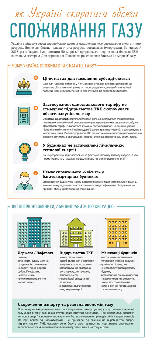 Наприклад, якщо замінити обладнання та мережі тільки у системі центрального теплопостачання, а житлові будинки лишити як є, то бажаного скорочення споживання газу не відбудеться. Адже на рівень споживання енергоресурсів більш за все впливає саме кінцевий споживач.