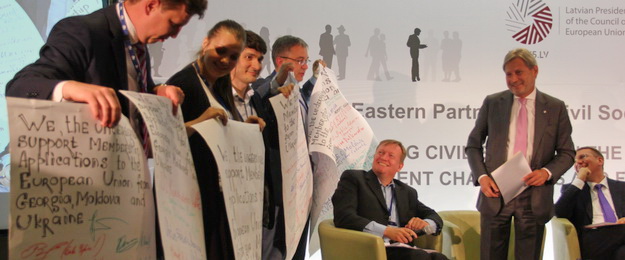 У четвер, 21 травня, представники громадянського суспільства передали єврокомісару Йоганесу Гану та головуючій в ЄС Латвії заявку на вступ до Євросоюзу.