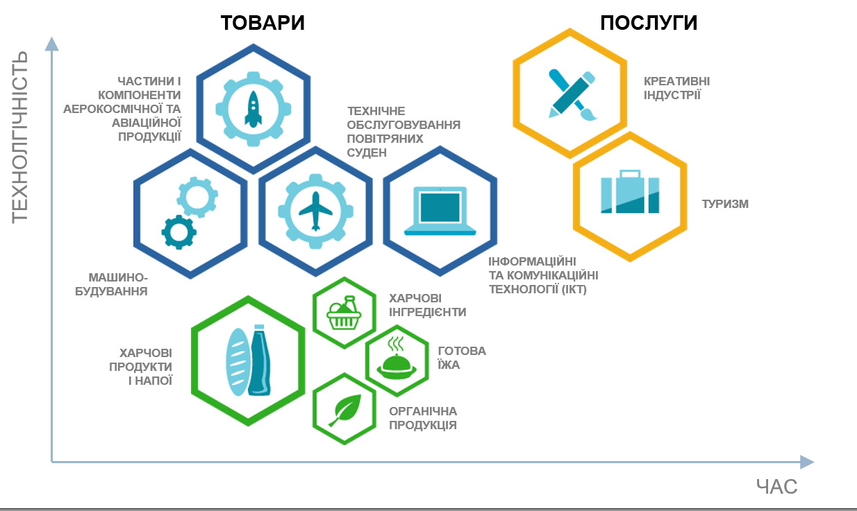 Сектори було обрано на основі кластерного підходу з метою визначення майбутньої траєкторії розвитку. При цьому ми враховували наявні на сьогодні ресурси і конкурентні переваги та зростаючий попит на закордонних ринках. Отже, серед обраних секторів: