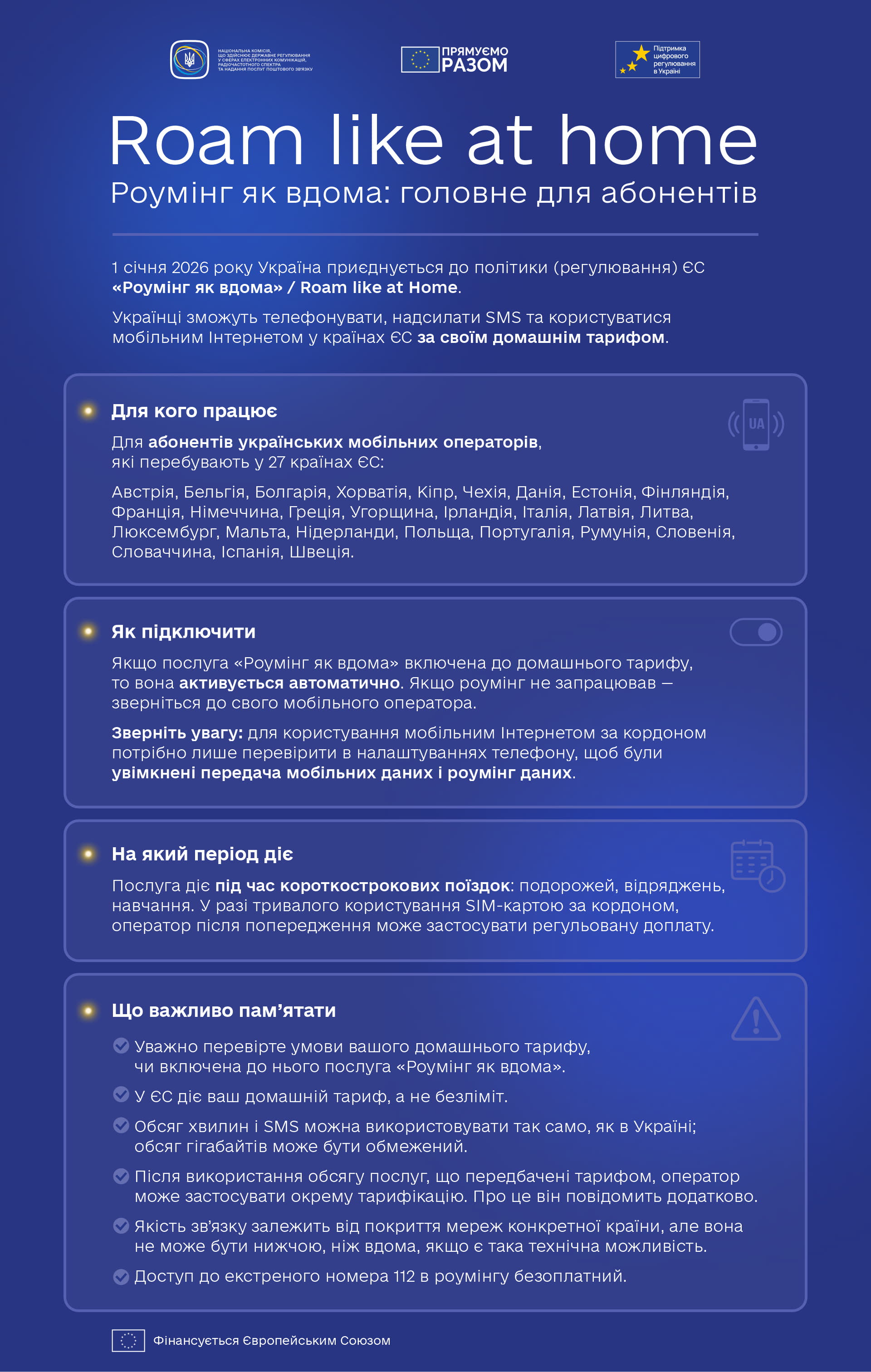 Політика (регулювання) "Роумінг як вдома" (Roam like at Home) почне діяти для України на тих самих умовах, що й для держав-членів ЄС. Аналогічні правила діятимуть і для європейських абонентів, які подорожують в Україну.