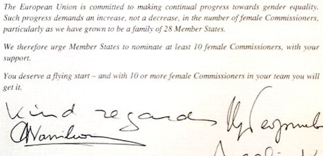 Жінки-єврокомісари з адміністрації Жозе Мануела Баррозу направили Жану-Клоду Юнкеру, найвірогіднішому кандидату на пост наступного президента Європейської комісії, відкритого листа, в котрому закликали його призначити як мінімум 10 жінок єврокомісарами.