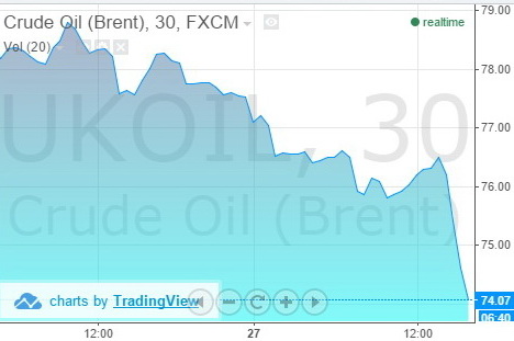 Онлайн-індикатори показують, що протягом 40 хвилин котування на нафту Brent впали на півтора долара та "пробили" позначку в $75.