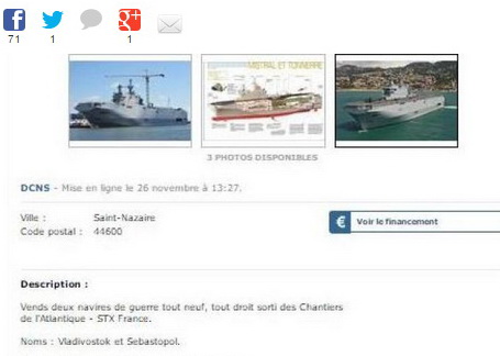 Після рішення французької влади призупинити постачання "Містралів" до Росії на сайті Le Bon Coin, що розміщує приватні оголошення, з’явилася об’ява про продаж двох вертольотоносців.