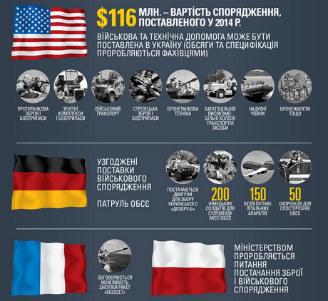 Серед країн, що можуть розпочати постачання в Україну летального озброєння, названі також Польща та Франція. Інформація щодо можливих постачань з Франції додатково деталізована. В інфографіці зазначено, що наразі "обговорюється можливість закупки ракет типу 'Екзосет".