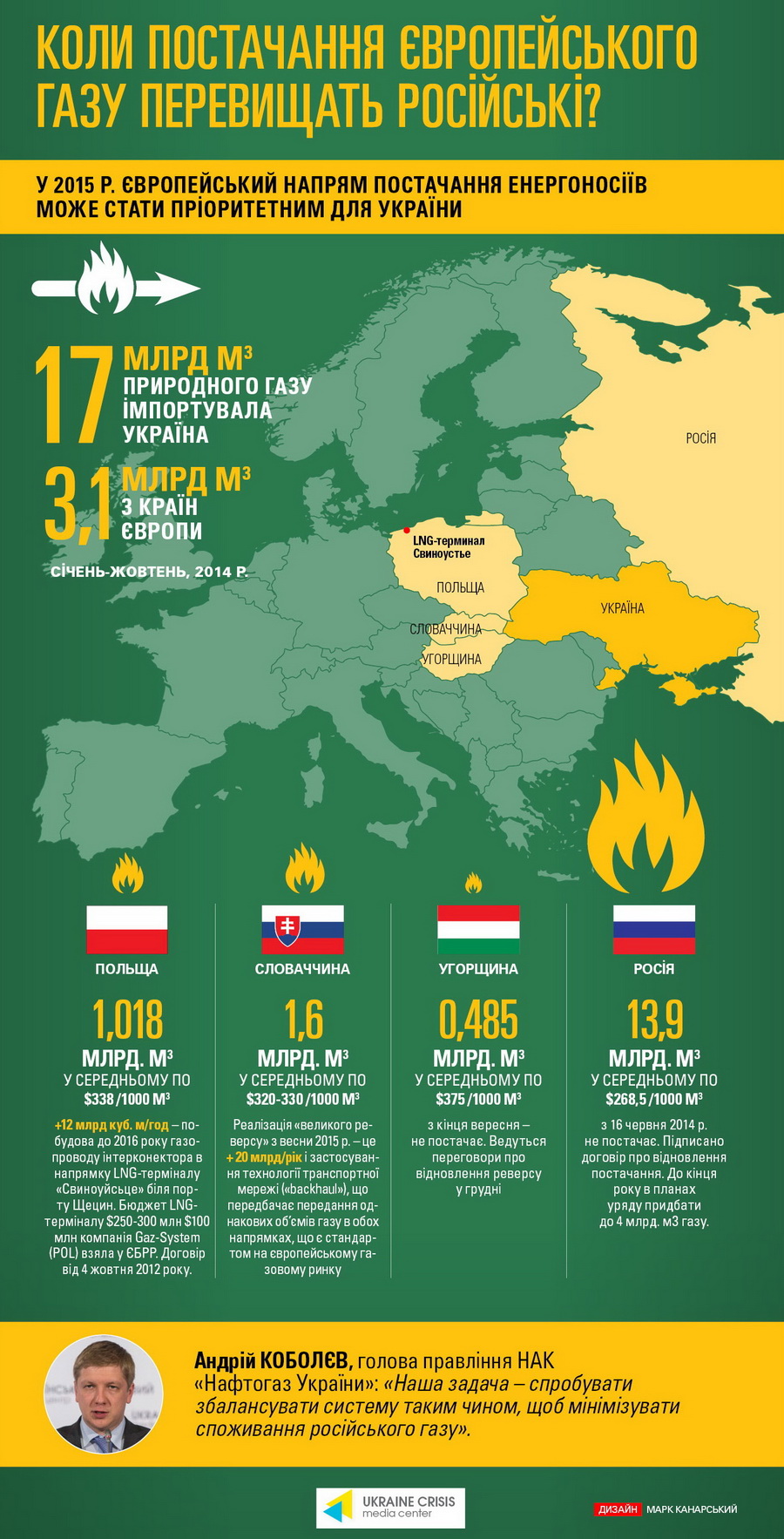 Зокрема, вже в січні-жовтні 2014 року із загальних імпортованих Україною 17 млрд кубічних метрів газу 3,1 млрд надійшло з країн Європи.