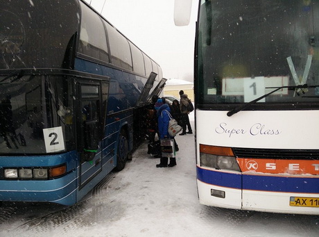 На автобусах помітні номери Харківської області, вірогідно, туди спочатку й відправляться переселенці. У Харкові працює генеральне консульство Польщі в Україні.
