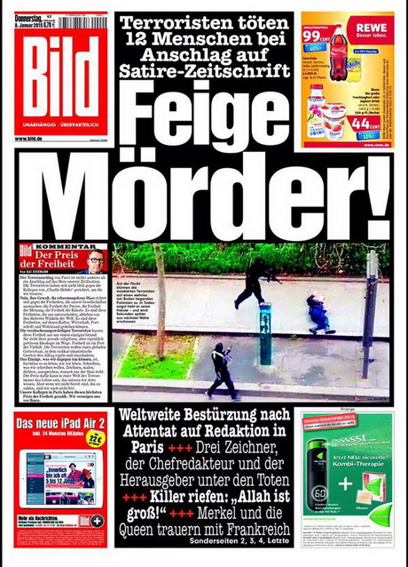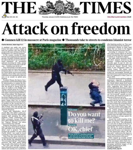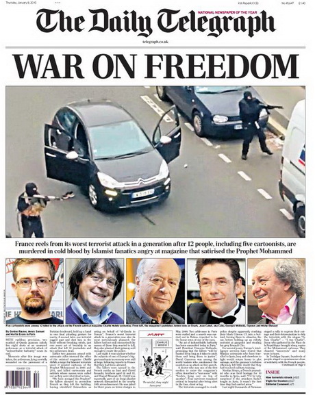 В четвер всі провідні європейські видання присвятили перші шпальти теракту, скоєному 7 грудня у редакції паризького сатиричного журналу Charlie Hebdo.