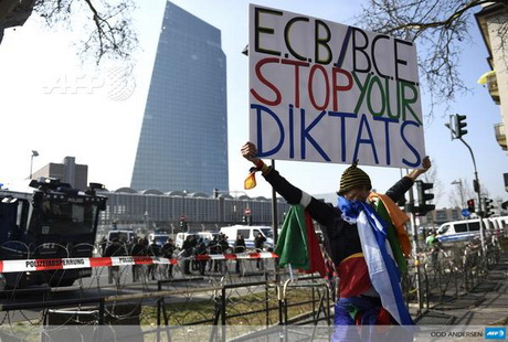 Протестувальники також підпалили кілька поліцейських автомобілів і закидали камінням правоохоронців. Приводом для протестів стала церемонія відкриття нового офісу Європейського центробанку (ЄЦБ).