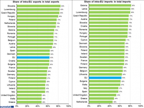 Найбільше товарів в інші держави-члени ЄС експортувала Словаччина (84% всередині ЄС від загального обсягу експорту), Люксембург (83%), Чехія (82%), Угорщина (80%), Польща (77%), Нідерланди (76%) і Словенія (75%).