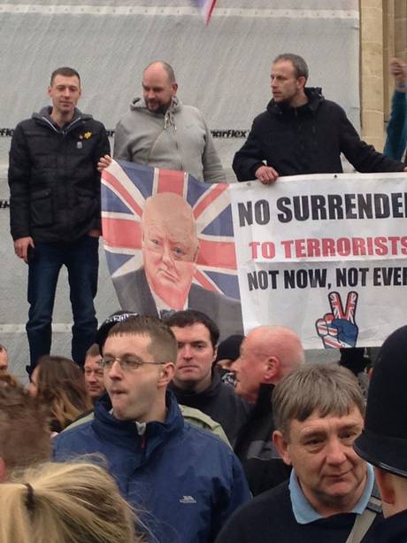Також вони тримали плакати з портретом Вінстона Черчілля та слоганом "Не здамося тероризму".