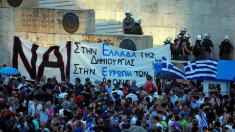 "Ми лишаємось в Європі", "Греція, Європа, Демократія" і "Геть!" були основними лозунгами демонстрантів, які зібралися ввечері на площі під будівлею грецького парламенту.