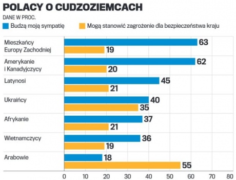 55% поляків вважають, що араби можуть становити загрозу для їхньої країни, 35% дотримуються такої думки про українців.