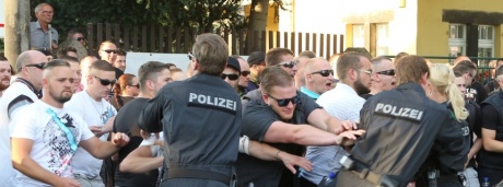 Згідно з інформацією, в ніч на суботу представники праворадикальної Націонал-демократичної партії Німеччини закидали прихильників табору петардами та камінням.