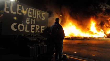 В рамках акції "Ніч бідних фермерів" багато фермерів вивели на вулиці свої трактори і вантажівки з сіном, гноєм і шинами, перекривши кілька доріг.