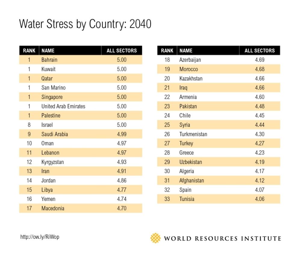 Країна, чия потреба у воді оцінюється в більш ніж 80% своїх вільних поверхневих вод, класифікована як "дуже високий" ризик дефіциту води.