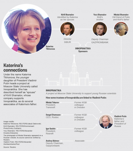 Агентство Reuters також повідомляє, що раніше в цьому році 29-річна Катерина назвала себе "дружиною" Кирила Шамалова, сина Миколи Шамалова, давнього друга президента. Шамалов-старший є акціонером банку "Росія", який американські чиновники називають особистим банком російської еліти.
