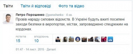"Провів нараду силових відомств. В Україні будуть вжиті посилені заходи безпеки в аеропортах, містах, запроваджено спецрежим на кордонах",- пише він.