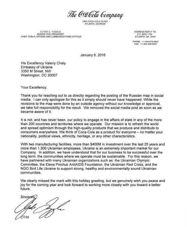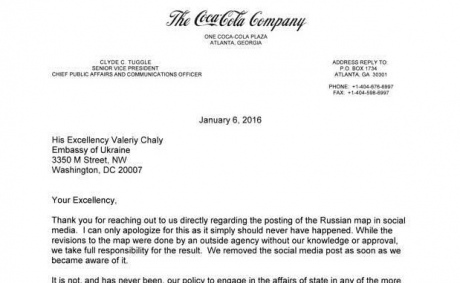 "Нам лишається тільки перепросити за це, адже цього (публікації карти РФ з Кримом - ЄП) просто не мало статися", - йдеться в листі за підписом Старшого віце-президента компанії "Кока-Кола" Клайда Таггла на ім’я посла України в США Валерія Чалого.