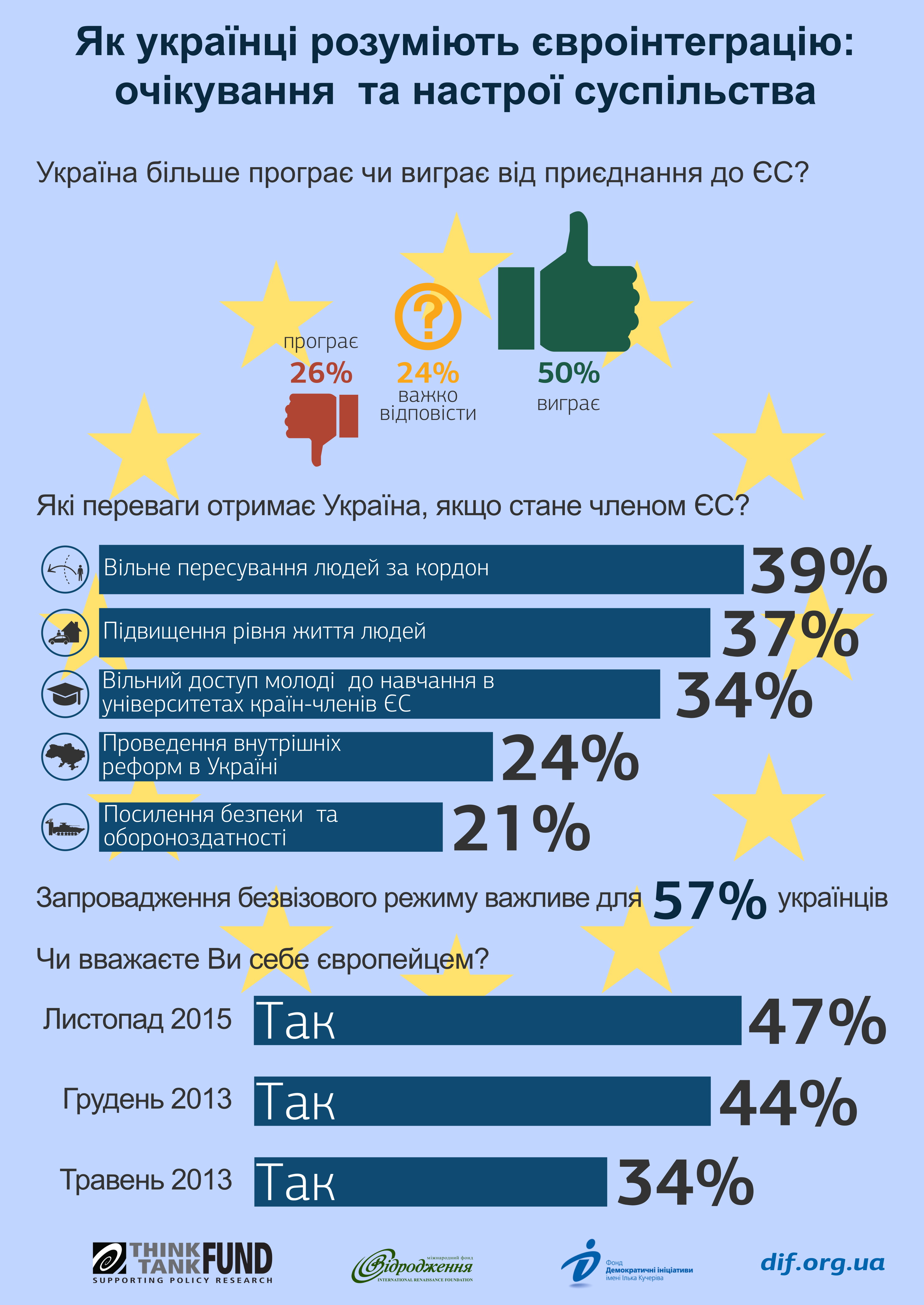 Для того, аби відчувати себе європейцями повною мірою, українцям потрібний певний рівень матеріального добробуту – так вважають 47% населення; відчуття захищеності з боку закону (33,5%), повага цінностей демократії та прав людини (23%) та можливість їздити до інших європейських країн без віз (23%).