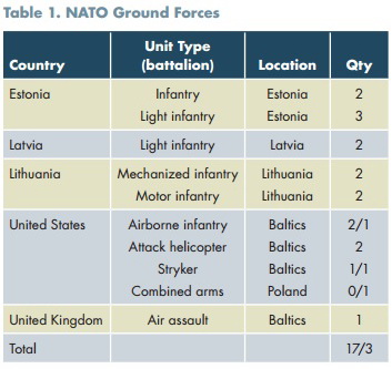 НАТО має 12 батальйонів у країнах Балтії, проте сім із них є надзвичайно легкими, у них відсутня тактична мобільність, і вони погано оснащені для боротьби проти броньованого противника. Крім того, НАТО не має в регіоні жодного основного бойового танку.
